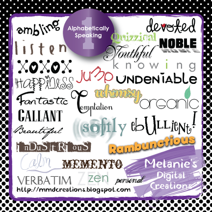 Today's word art set is based on the alphabet. I challenged myself to sit down with a sheet of paper, divided into 3 columns, and wrote down random words beginning with each letter of the alphabet. The challenge was to stick with what I wrote down--the first words that came to me. Some you may not often see in the word art you collect, so hopefully, it provides you with a challenge as well! It makes life interesting, KWIM? :)